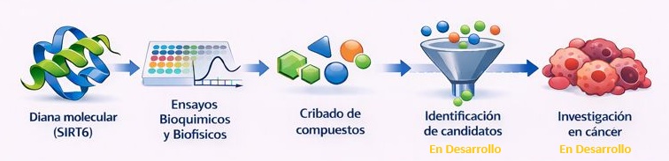 El proyecto ScreenTech-LEUSIR forma parte del Plan Complementario de Biotecnología Aplicada a la Salud y se ha centrado en el desarrollo de herramientas experimentales para la identificación de nuevas estrategias terapéuticas frente a las leucemias, mediante el estudio de dianas moleculares claves implicadas en la respuesta al estrés celular y la estabilidad genómica. En concreto, el proyecto ha abordado la puesta a punto y validación de ensayos para identificar moduladores de la actividad de SIRT6, miembro de la familia de Sirtuínas, enzimas dependientes de NAD⁺ con un papel relevante en cáncer y envejecimiento. Durante el desarrollo del proyecto se optimizaron los protocolos de producción y purificación de SIRT6 recombinante, garantizando la obtención de proteína funcional y reproducible para su uso en ensayos bioquímicos y biofísicos. Asimismo, se desarrollaron y evaluaron distintos enfoques experimentales para el cribado de compuestos moduladores de SIRT6, incluyendo ensayos miniaturizados compatibles con plataformas semiautomatizadas y metodologías biofísicas de detección directa de interacción proteína-ligando. Estos trabajos permitieron definir una estrategia de cribado viable y robusta, adaptada a las características funcionales de la diana. Como resultado, el proyecto ha establecido una base tecnológica sólida para la identificación de compuestos con capacidad de interactuar con SIRT6, sentando las bases para futuras fases de validación funcional, optimización química y evaluación en modelos celulares de enfermedad. En conjunto, ScreenTech-LEUSIR ha contribuido al fortalecimiento de capacidades en descubrimiento temprano de fármacos asociados a SIRT6 y a la consolidación de colaboraciones entre centros de investigación en Catalunya y Galicia, alineándose con los objetivos estratégicos del Plan Complementario y su apuesta por la innovación biomédica con potencial impacto traslacional.